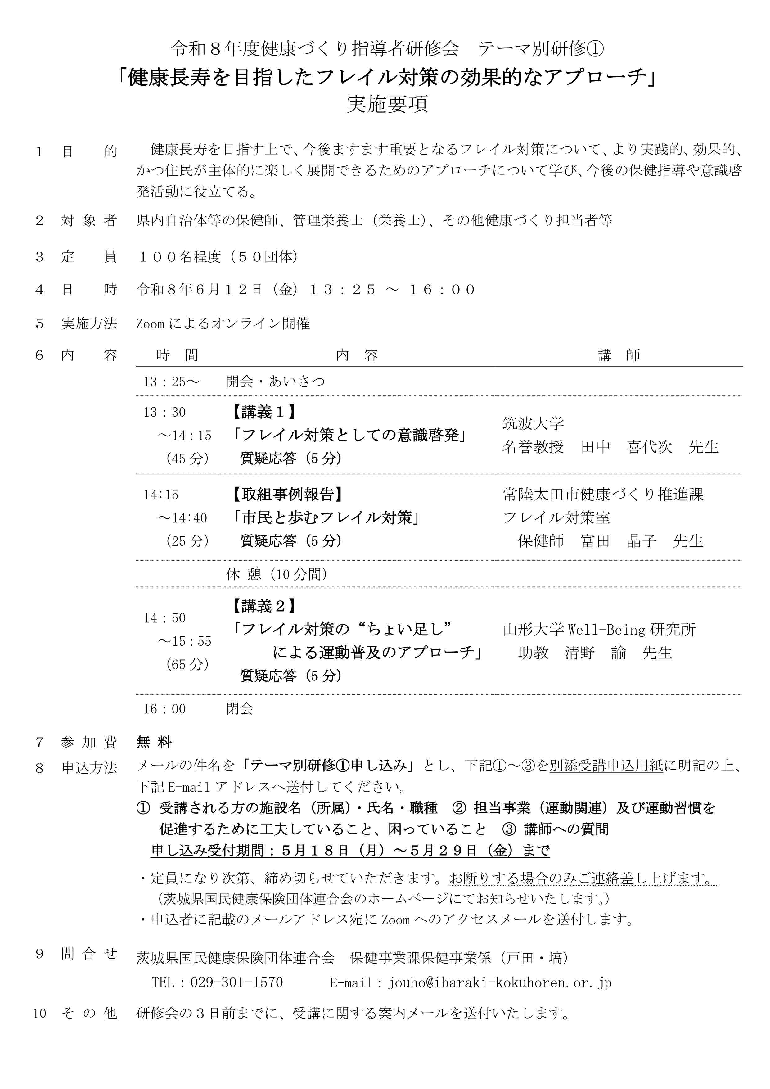 令和8年度健康づくり指導者研修会テーマ別研修①「健康長寿を目指したフレイル対策の効果的なアプローチ」の開催についてのお知らせです。