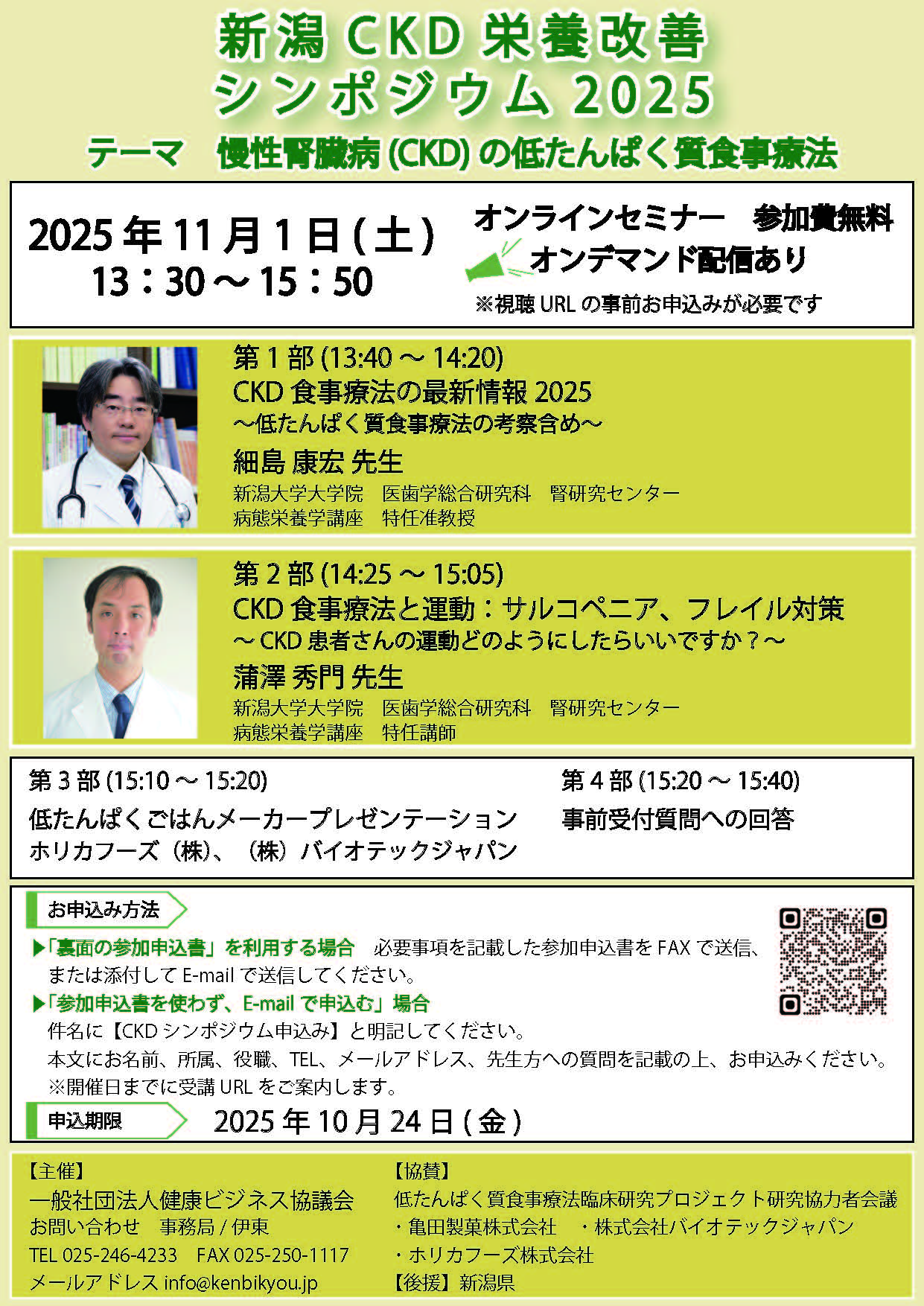【情報提供】新潟CKD栄養改善シンポジウム2025 開催のお知らせ(低たんぱく質食事療法臨床研究プロジェクト研究協力者会議 様) 低たんぱく質食事療法臨床研究プロジェクト研究協力者会議 様より、新潟CKD栄養改善シンポジウム2025 開催のお知らせです。 詳細は画像をクリックまたは【コチラ】。